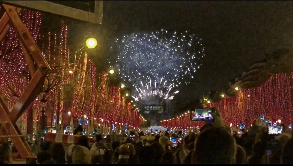 Fizemos um super jantar em casa por volta das 21h e às 23h pegamos um Uber até o ponto mais próximo da rua Champs Élysées, (naquela altura do dia 31 os arredores já estavam bloqueados pela polícia).