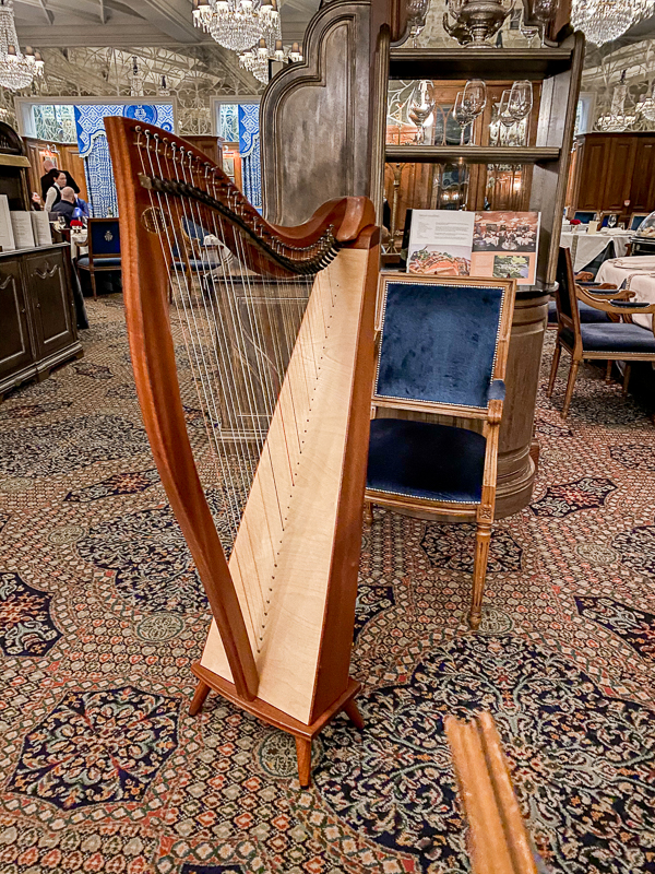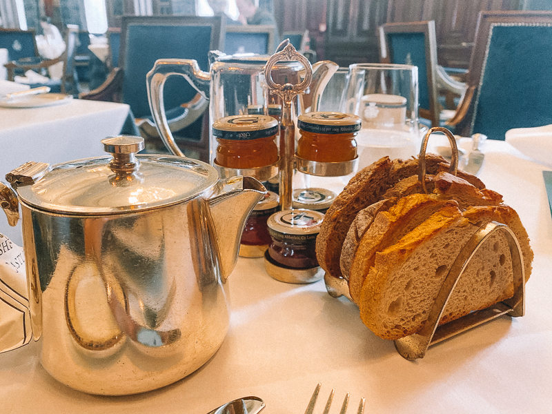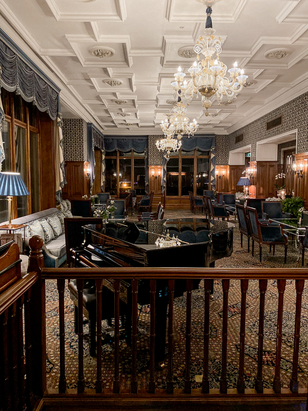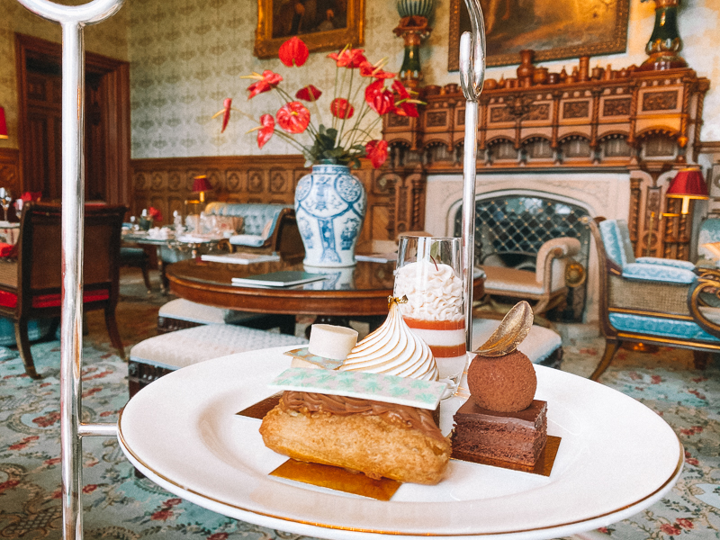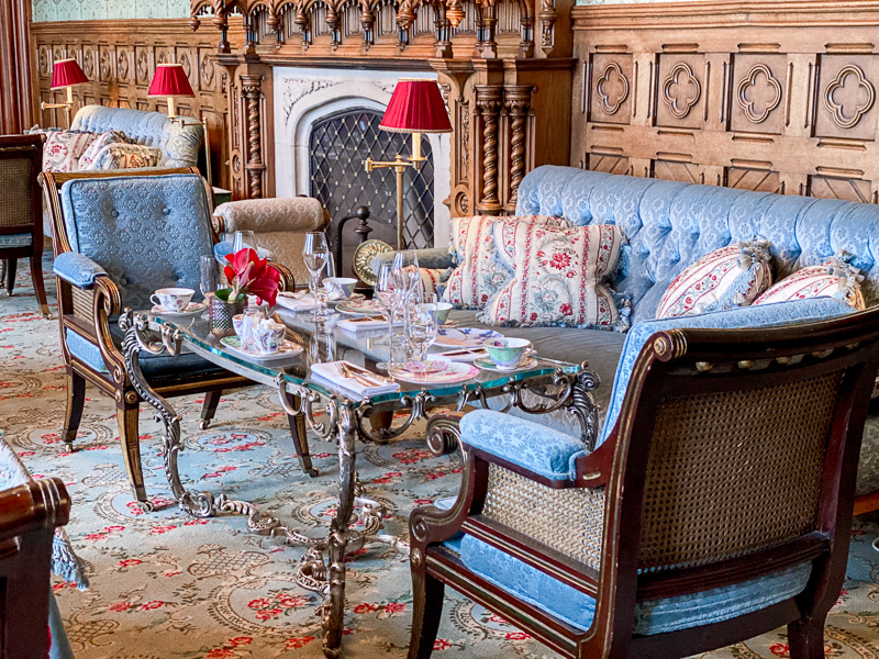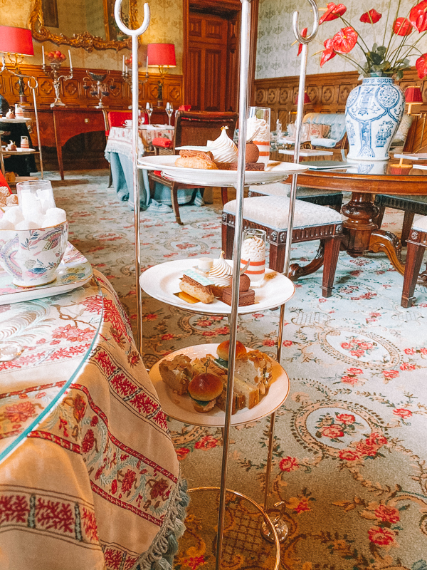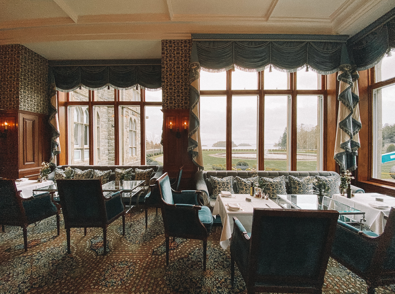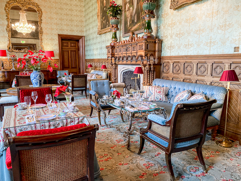 A sala de chás, The Connaught Room. De frente para o lago, essa charmosa sala com janelas que vão do teto ao chão e tem uma vista linda para o jardim, também pode ser usada para jantares privados, mas nós fomos para desfrutar uma tradicional tarde de chás. Esse chá é super tradicional no castelo e começou em 1868 com o Lord e Lady Ardilaun.