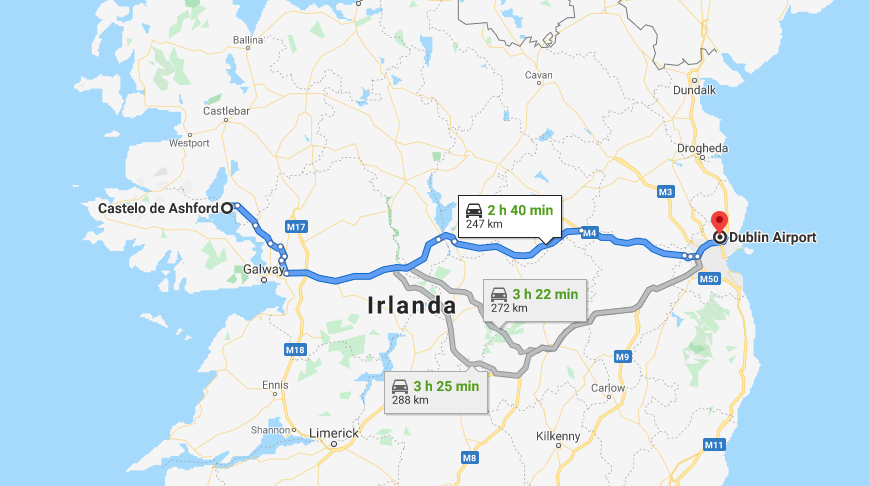 Para chegar ao Castelo de Ashford partindo do Aeroporto de Dublin, levará em média 3 horas de carro. Outra cidade referência é Galway, de lá, levará em torno de 1h para chegar ao castelo.