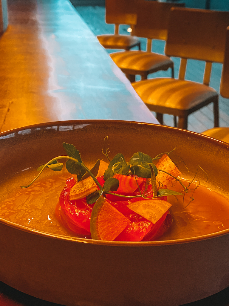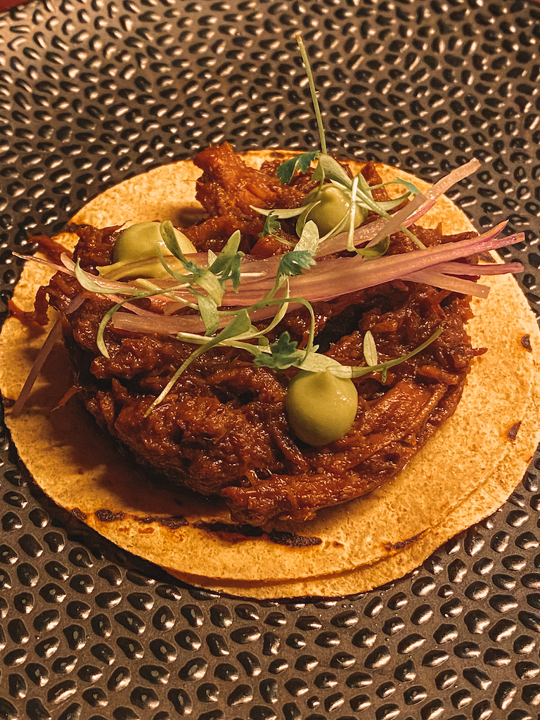 Logo após foi servido o Ora king Salmão com mel de abelha Melipona, Lagostins com milho branco e maionese feita com calda da cabeça dos lagostins, Tacos de Barbacoa de picanha Dry Aged, relleno negro (ervas mexicanas) e molho de tutano.