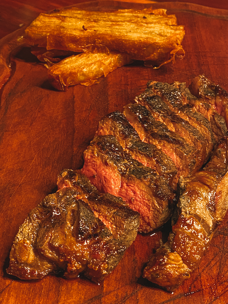 Para finalizar essa sequência maravilhosa de pratos salgados, foi servido o Dry Aged Kansas Steak um corte de carne macio e saboroso acompanhado de uma batata deliciosa.