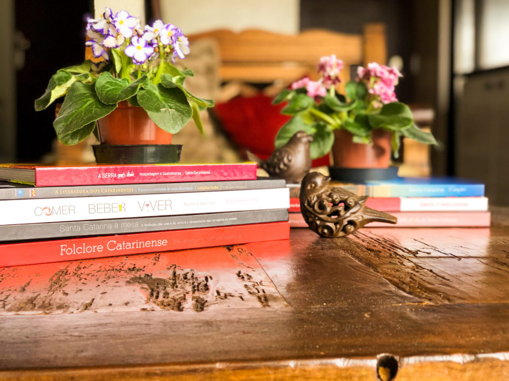 Vários lugares aconchegantes para ler um livro ou jogar conversa fora. Ahhh, a seleção de livros que tinha na mesa de centro da sala achei incrível. Muitas coisas sobre Santa Catarina que eu não conhecia.