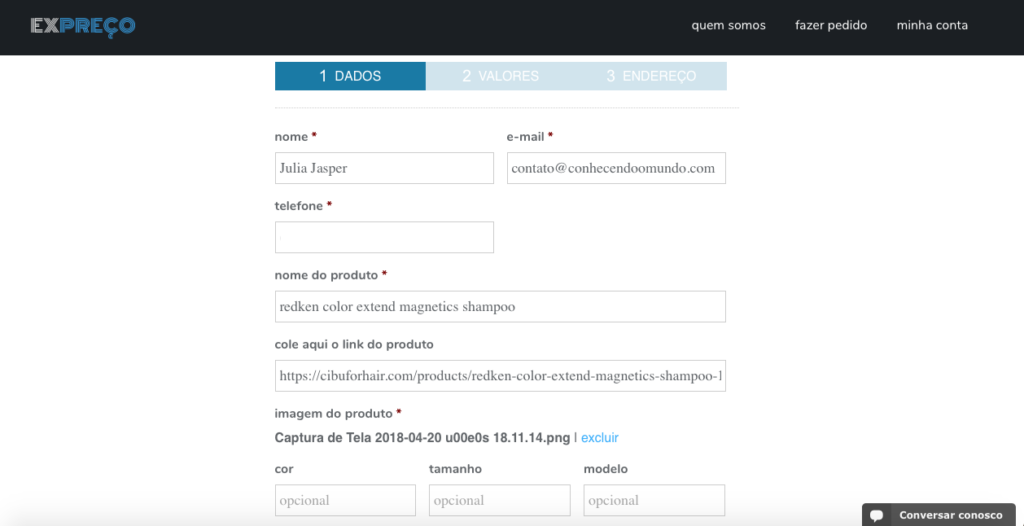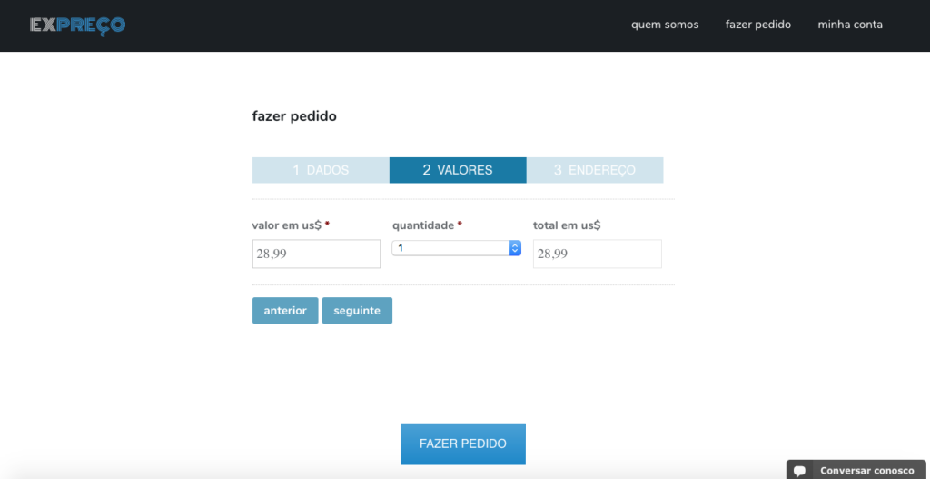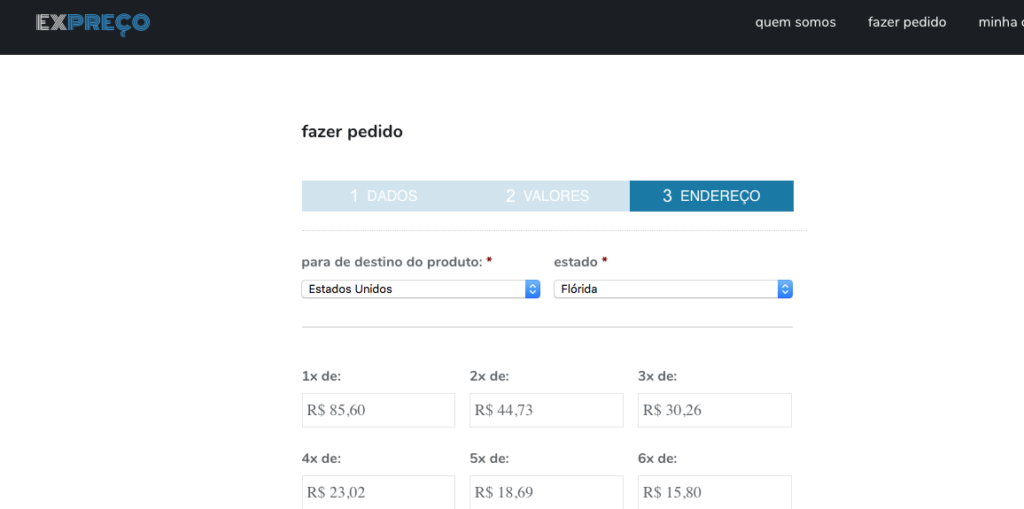 Entro no site da ExPreço AQUI. Preencho todos os dados e envio para eles. Eles vão me responder um email com o valor do orçamento para aquele produto que eu escolhi.