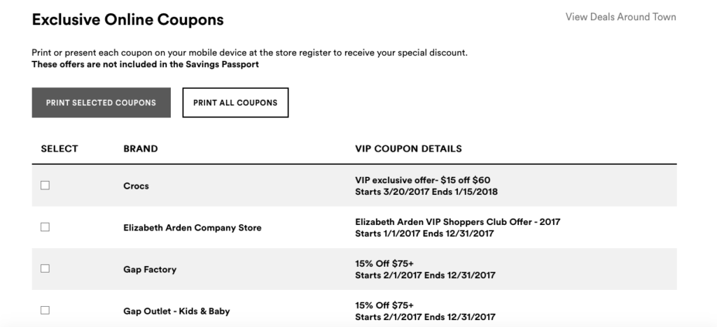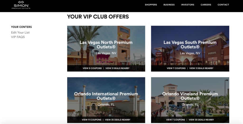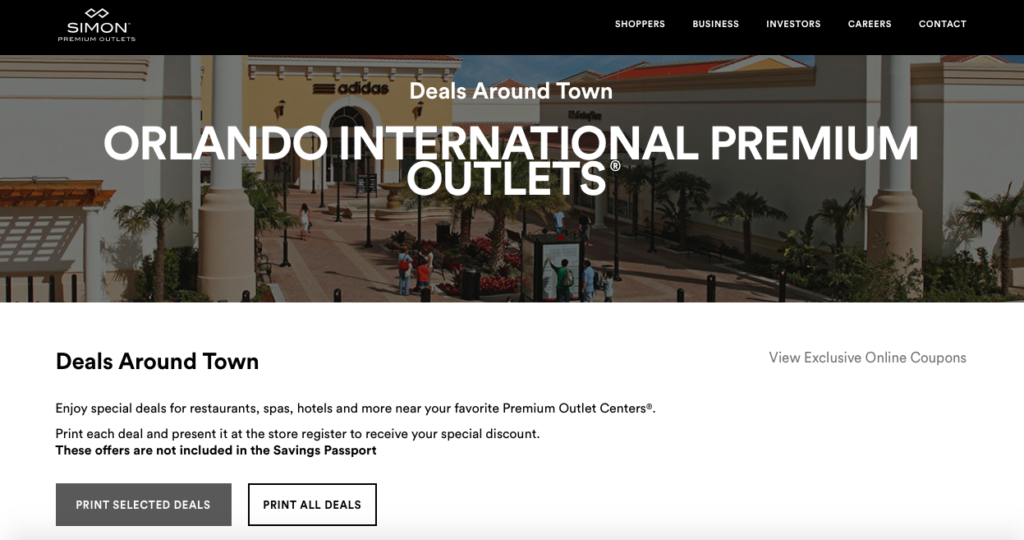 Esses são alguns da minha seleção. Vou mostrar para vocês com um dos outlets de Orlando. É só clicar em cima do outlet escolhido e vão aparecer as promoções exclusivas para aquele lugar. Você pode selecionar só o que te interessa ou imprimir todos.
