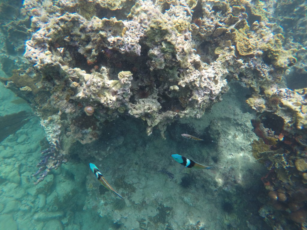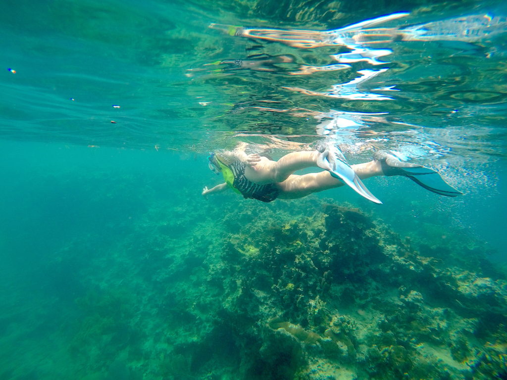 Chegando lá todos receberam um colete, máscara e snorkel e já foram pulando na água e seguindo o guia. Foi a primeira vez que mergulhei e até me acostumar e entender que eu não poderia respirar pelo nariz, abrir a boca, etc, engoli metade da água do oceano. Ainda bem que o maridão deu umas dicas porque o guia já estava longe.