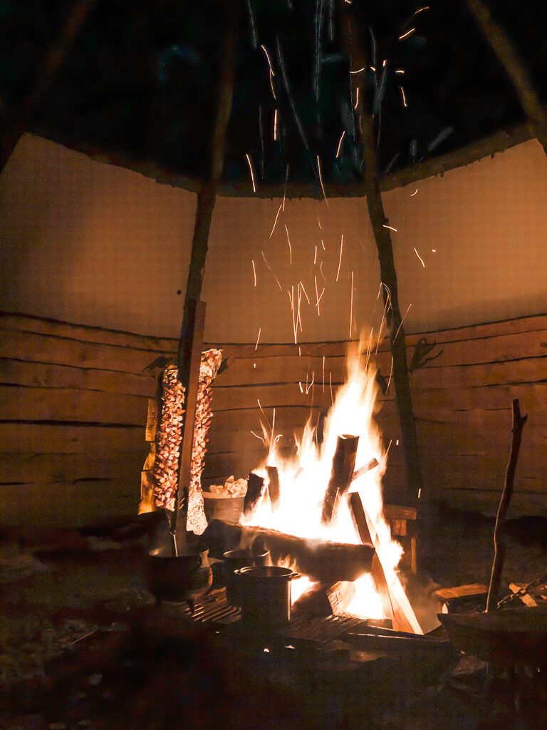 Literalmente no meio do bosque, com um caminho iluminado por tochas, chegamos em uma oca. A oca que passaríamos as próximas horas.