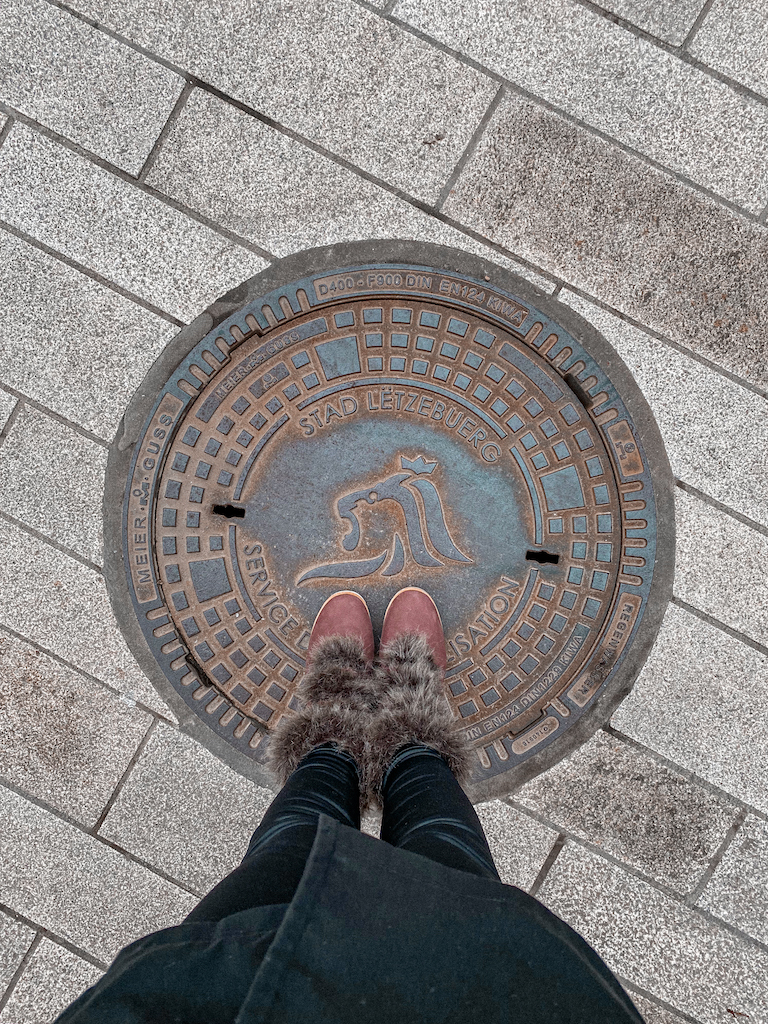 Bueiro com nome da cidade em Luxemburguês