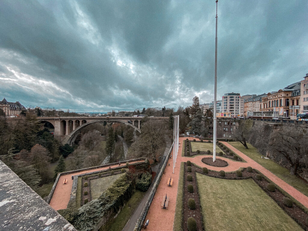 Um jardim lindo e muito bem cuidado, bandeiras e uma vista incrível para a ponte Adolphe. Essa é a praça da Constituição.