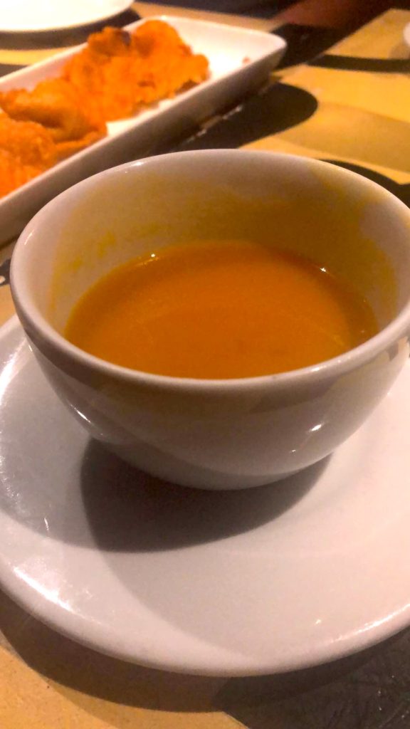 De entrada ele trouxeram uns carpaccios de bacalhau com algum tipo de farinha deles, depois trouxeram uma sopa que estava muito gostosa (tudo por conta da casa).