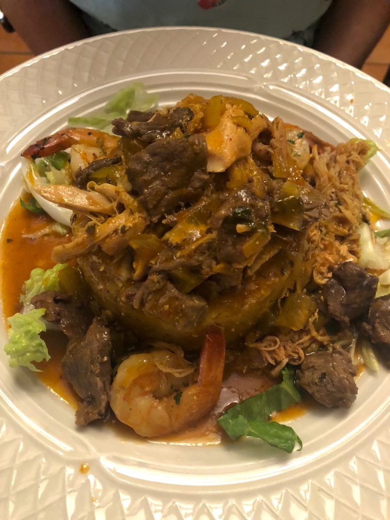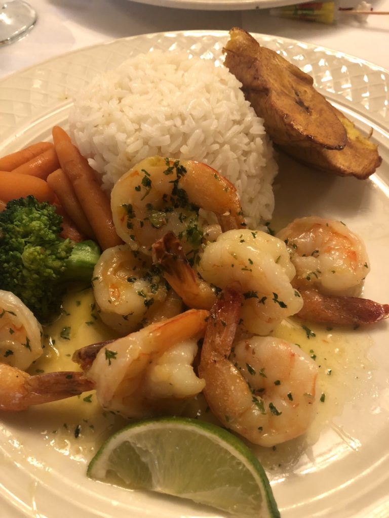 Vamos à comida!! O prato tradicional de Porto Rico é o Mofongo, é um tipo de banana amassada ou purê de banana, não sei definir ao certo, com qualquer coisa que você escolher por em cima rsrsrrs, pode ser camarão, frango, carne de boi ou tudo junto. Como eu não como banana pedi um camarãozinho com arroz e o restante da mesa foi no tal Mofongo, cada um de um tipo e com a bendita banana de base. Todos amaram o Mofongo!!