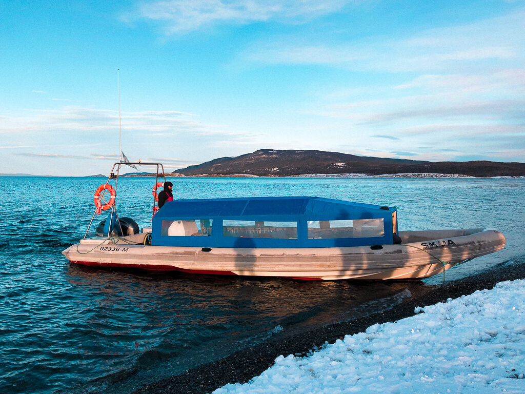 Todos os passeios em Ushuaia saem pontualmente no horário informado. Fomos até o porto, apresentamos nossos vouchers na casinha da empresa Piratour (responsável e única na ilha com direito a oferecer esse passeio) e pagamos a taxa portuária de 40 pesos por pessoas, recebemos nosso crachá e aguardamos o barco chegar.