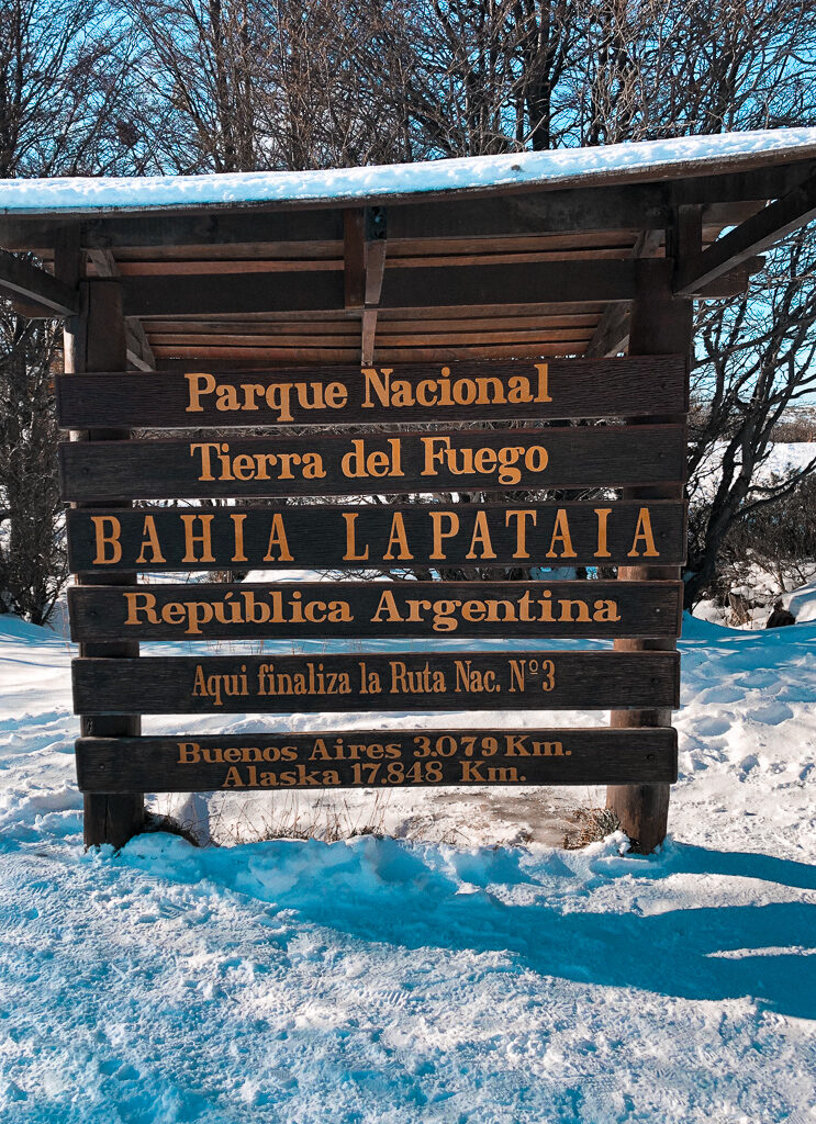 No Parque Nacional você também irá encontrar o final da Ruta 3, a estrada pan-americana que vai desde o Alasca, até ali na placa, no fim do mundo.