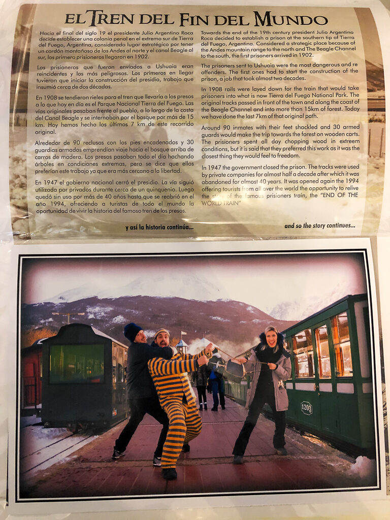 Chegamos na estação de trem do fim do mundo, fomos trocar nossos vouchers por ingressos e logo já chegou nossa vez de embarcar. Cada pessoa ganha um fone de ouvido para poder ouvir a história do trem, dos prisioneiros e outras curiosidades locais. (tem áudio em português).