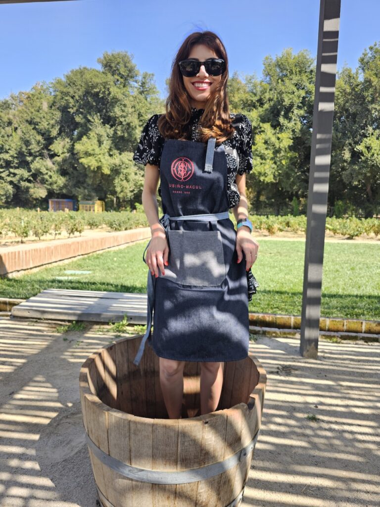 Em uma visita recém à Cousiño Macul, participei do Tour Vendimia, realizado durante a colheita da uva — e foi simplesmente incrível! É uma experiência única: além de aprender sobre a história da vinícola, a gente colhe as uvas, pisa com os pés como antigamente, conhece os bastidores da produção e ainda faz uma deliciosa degustação de vinhos com uma tábua de queijos no jardim da propriedade.
